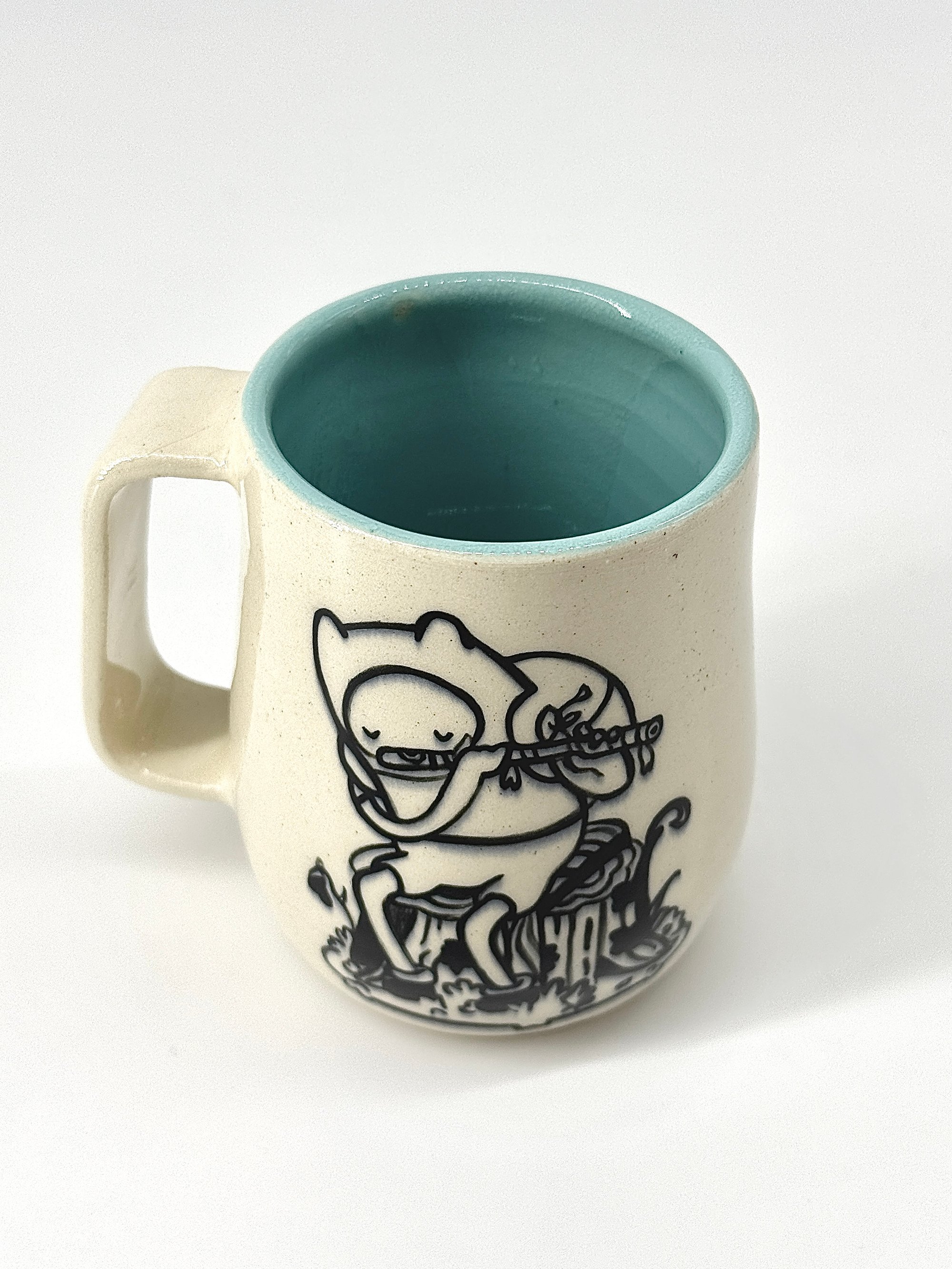 - Hand-painted ceramic mug inspired by Adventure Time, featuring Finn on the front playing the flute in black underglaze. Finished with a bright tiffany blue glaze on the interior and a clear glossy glaze on the exterior.