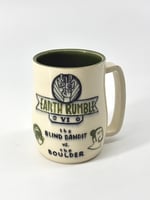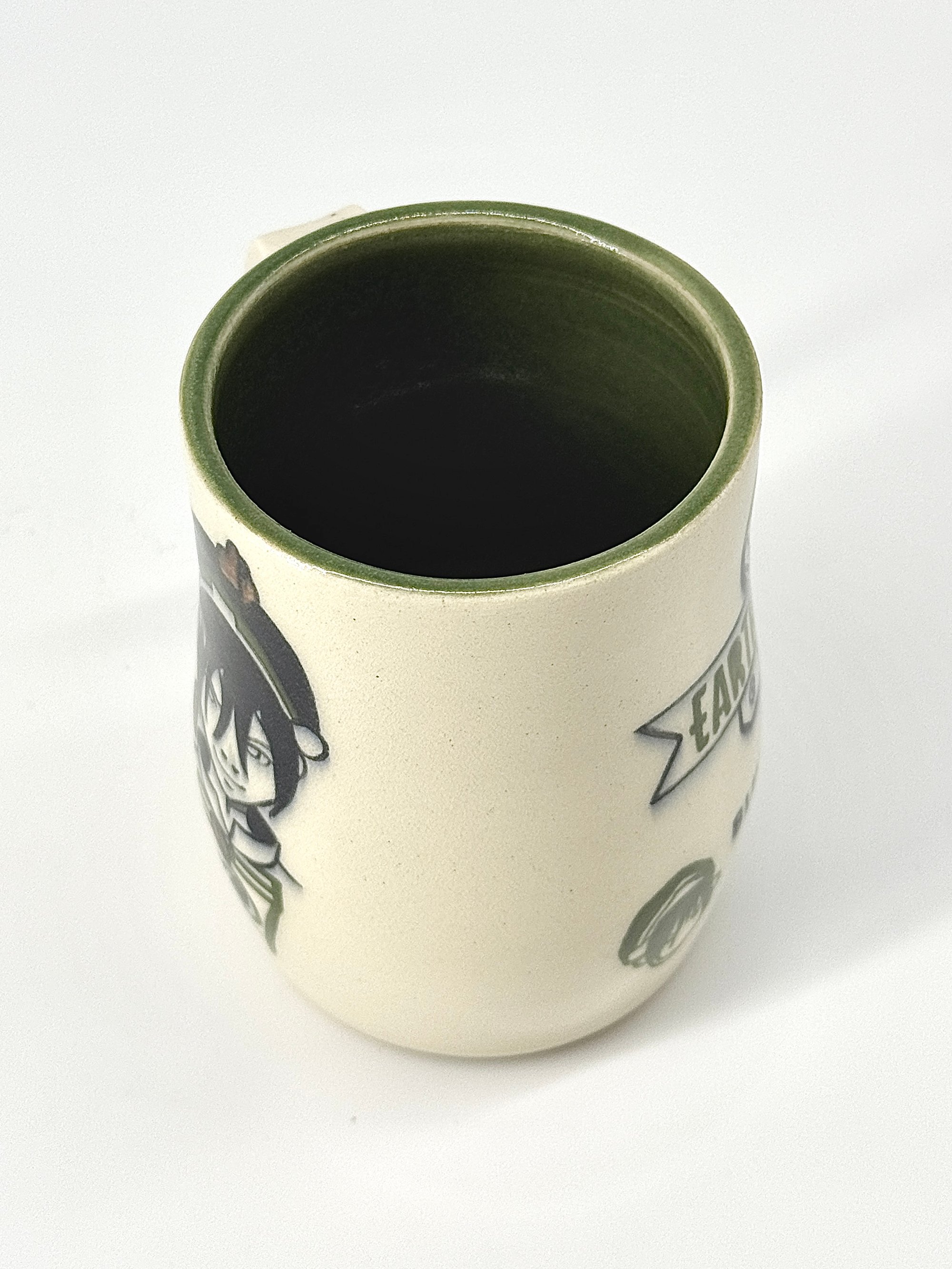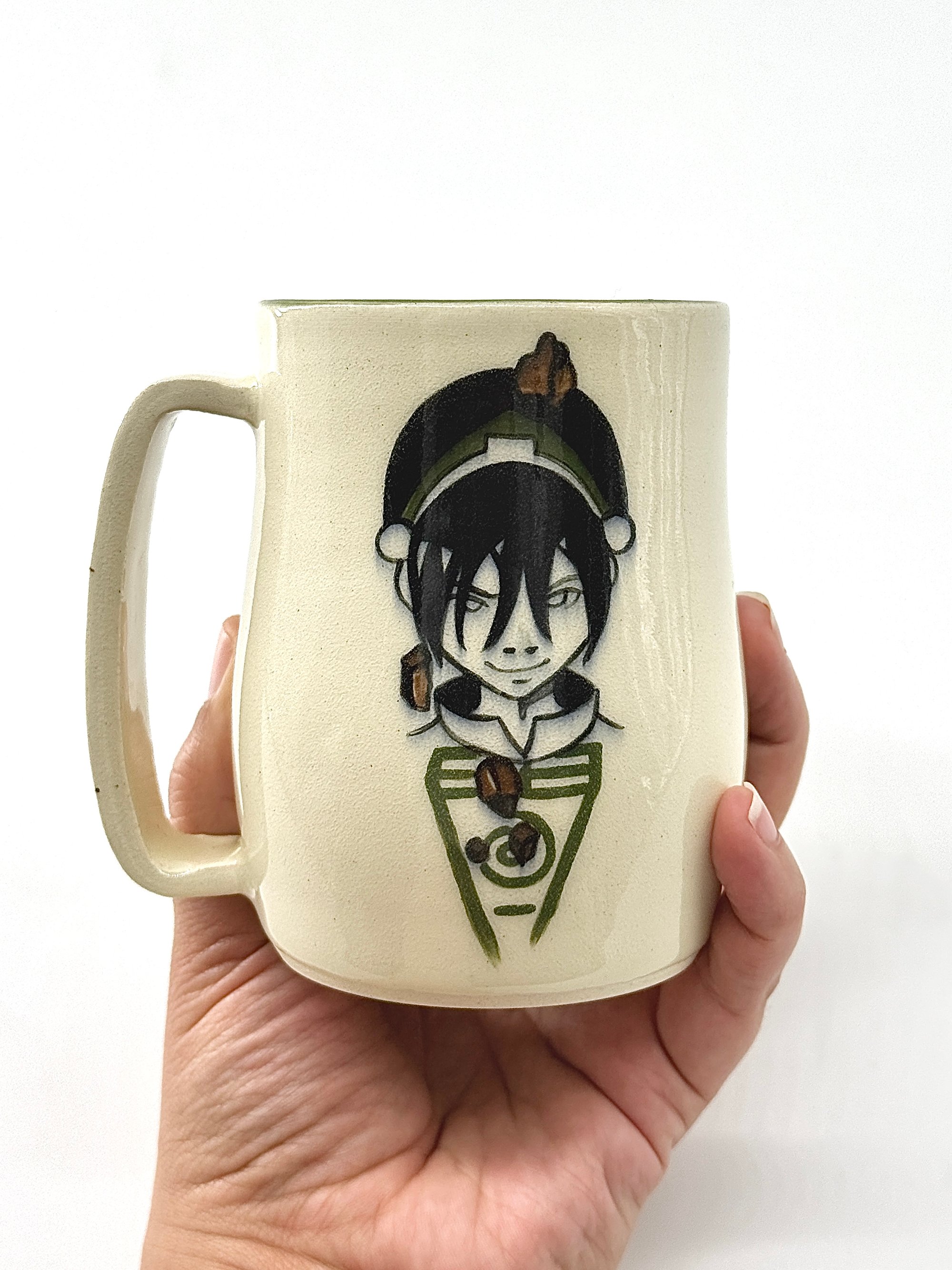 - Hand-painted ceramic mug inspired by Avatar: The Last Airbender, featuring Toph illustrated on one side and an Earth Rumble showdown — the Blind Bandit vs. the Boulder — painted on the other.
