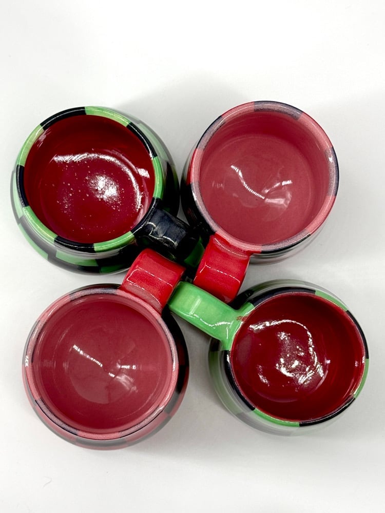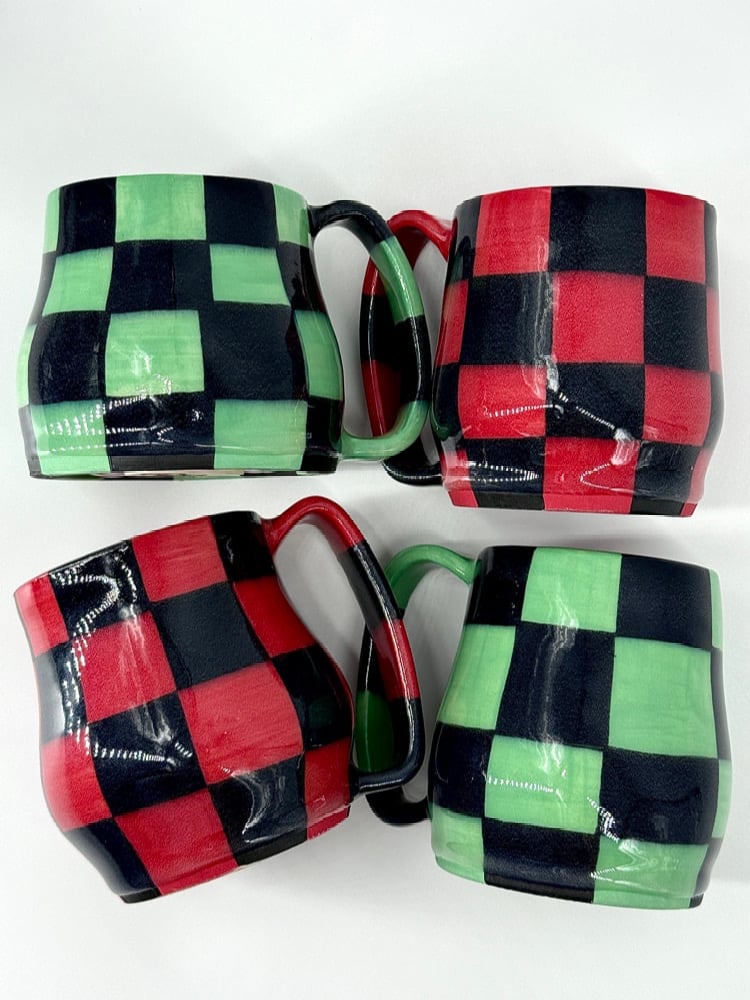 • Hand-painted ceramic mugs featuring a bold, abstract checkerboard pattern inspired by Demon Slayer’s iconic aesthetics.
