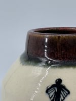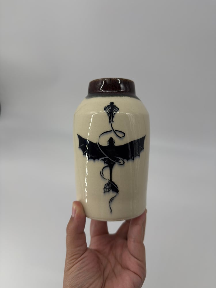 • Hand-painted vase with a simple black silhouette design of Toothless and Hiccup.